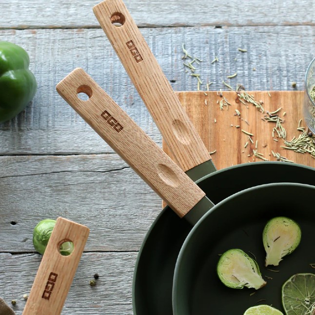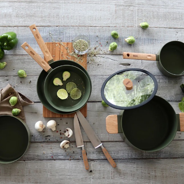 Pann on valmistatud 3,5 mm sepistatud alumiiniumist ja kaetud Greblon C3 keraamilise mittenakkuva kolmekordse kattega, mis on vastupidav ja ohutu tervisele. Töötlemata viimistlusega tammepuidust käepide täiendab esteetikat ja tagab mugava haarde.