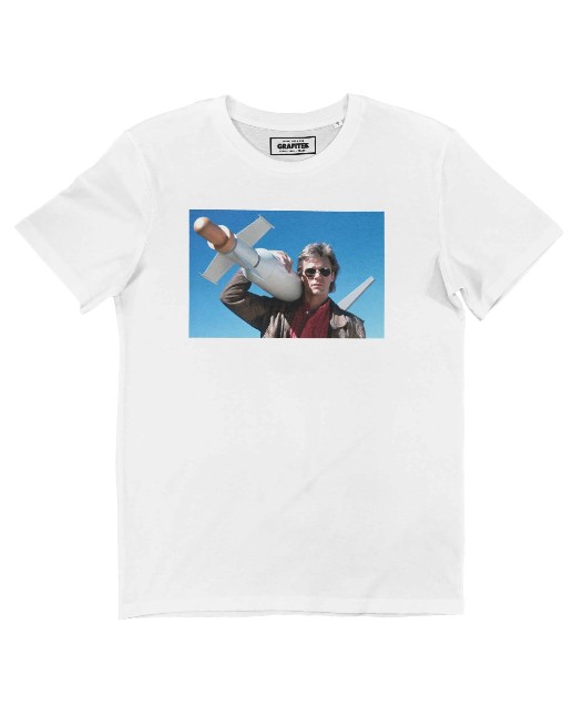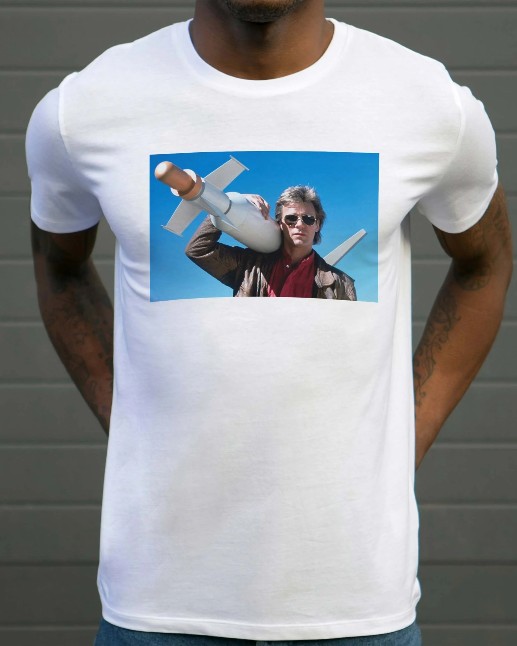 MacGyver Missile T-särk on energiline ja nostalgiline austusavaldus mehele, kes tegi võimatust võimalikku – seekord kujutatud rakett õlal, valmis tegutsema.